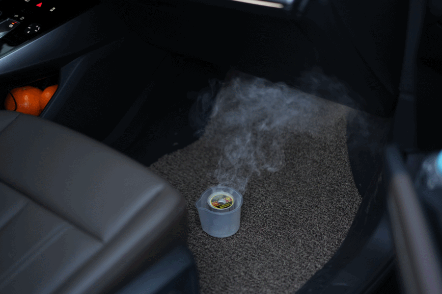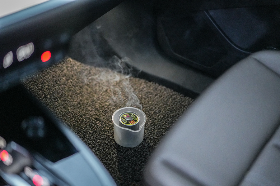 ④ 연기가 나면 차 문을 닫고 10~15분 정도 기다려주세요. 사용 중에는 차에 탑승하지 말고 밖에서 기다려주셔야 합니다. 그러다 보면 실내가 연기로 차기 시작하는데, 연기량은 상황에 따라 달라질 수 있습니다.