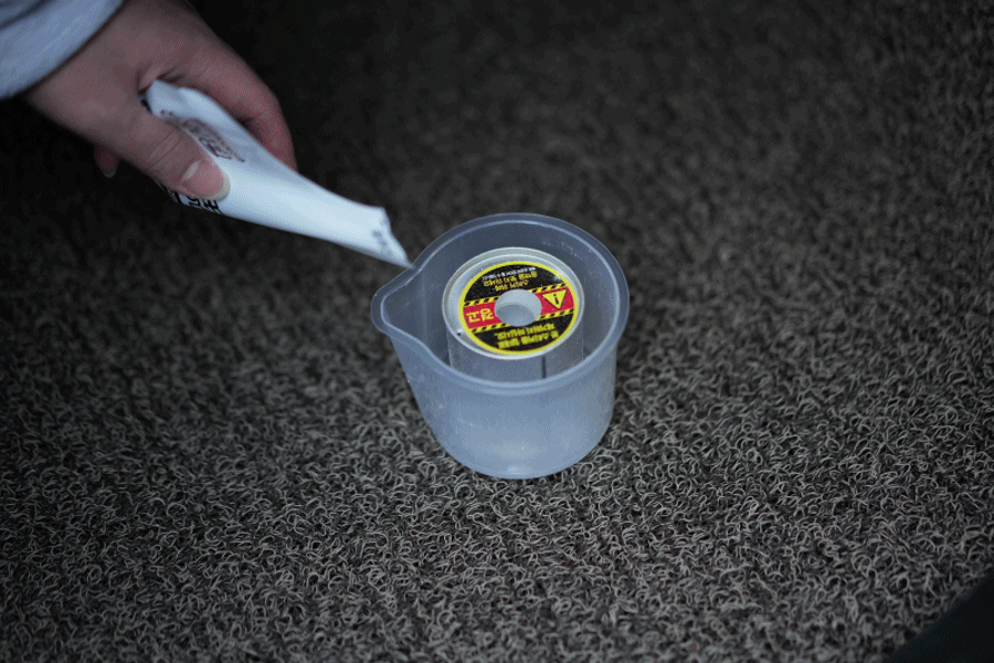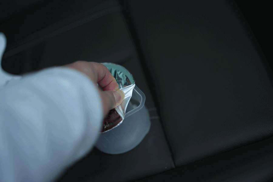 ② 그 후 용기의 은색 호일 필름을 제거하고, 조수석 발판 중앙의 평평한 부분에 놓아주세요.