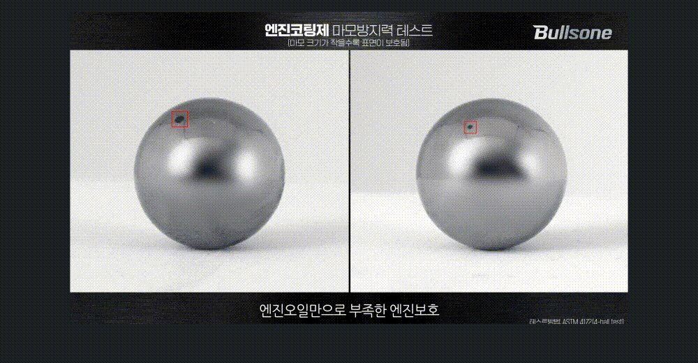 불스파워 시그니처는 다양한 테스트를 통해 안정성과 신뢰성을 입증했는데요. 상단의 볼을 회전하여 접촉된 부분의 마모를 확인하는 마모도 테스트입니다. 엔진오일만 들어간 금속과, 불스파워가 함께 첨가된 금속 표면을 비교하는 테스트인데, 마모 크기가 작을수록 표면이 보호됩니다.