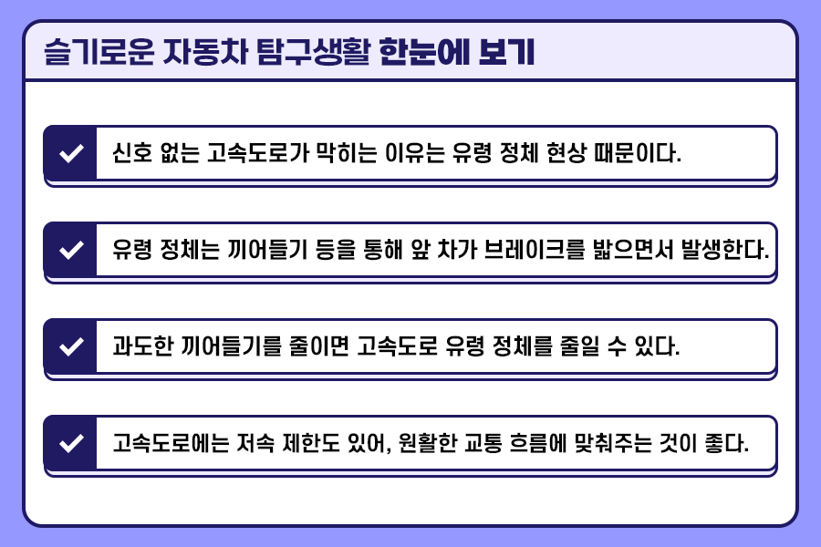 1차선을 추월차선으로만 잘 활용해도 차 막힘을 줄일 수 있습니다. 하지만 1차선에 정속 주행 차량이 나타나기 시작하면, 뒤 차량이 앞지르기 위해 다시 끼어들기를 시도하면서 유령 정체는 시작됩니다.