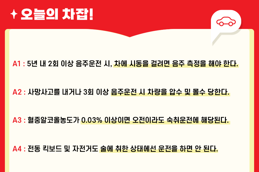 오늘은 음주운전에 대한 내용들에 대해 차문차답을 해보았는데요. 모든 질문 속에는 안전에 관한 이야기가 있으므로, 안전운전을 위해 필요한 내용입니다. 다음 주 역시 많은 분의 궁금증이 사라질 수 있도록 좋은 정보로 찾아뵙겠습니다!