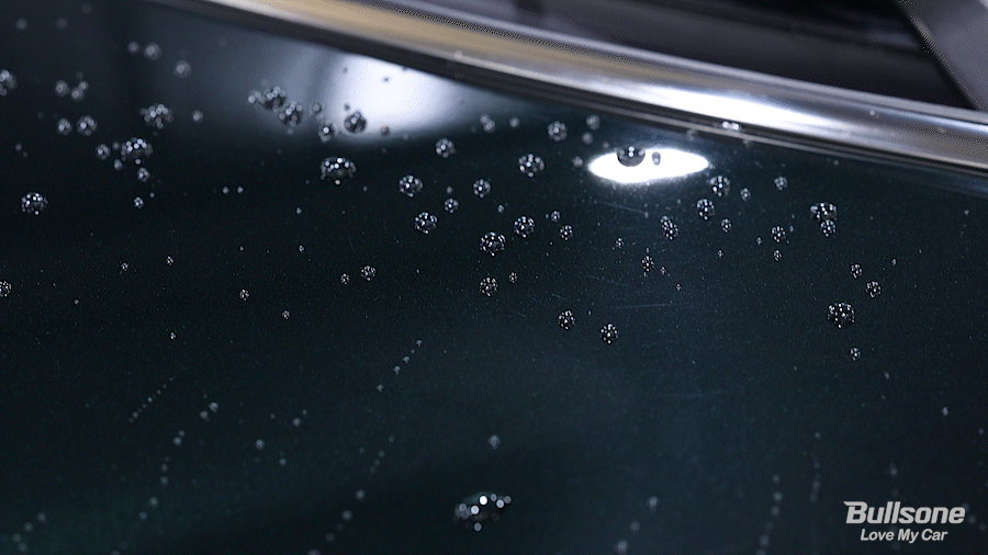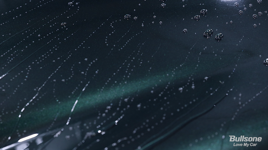 코팅 직후 비딩 확인은 참을 수 없죠! 더 루나왁스 익스트림 코팅이 완료된 도장면 위에 물을 뿌려보았는데요. 퍼지지 않고 완벽하게 맺히는 물방울이 보이시나요? 발수각이 113도에 이르는 극강의 발수 성능으로 뛰어난 비딩과 쉬팅 효과를 제공한답니다.